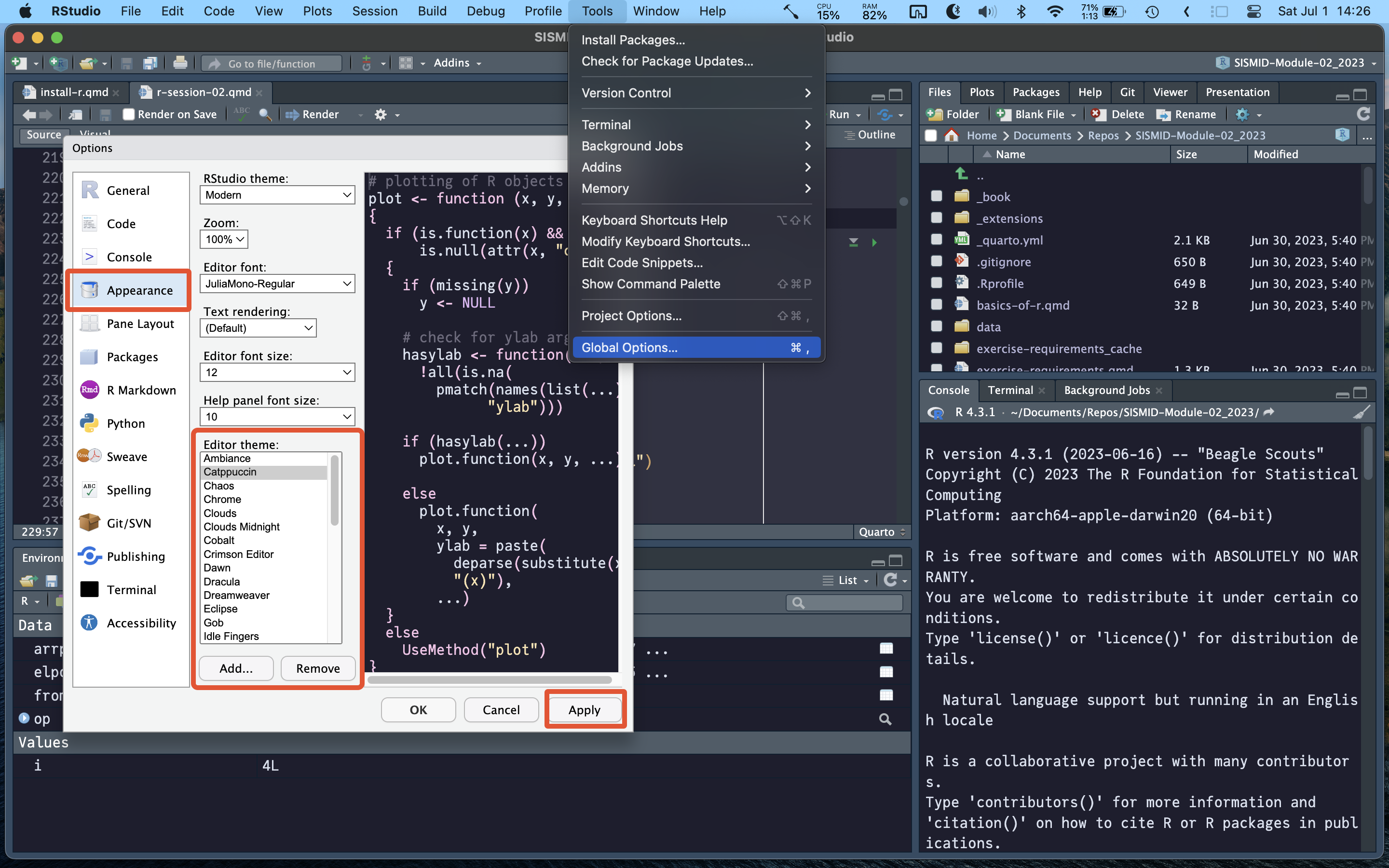 The first thing that’s worth doing is adding a theme - the default white background can be a little harsh when you spend a long time staring at code. Open up the global preferences (ctrl/cmd + ,), go to “Appearance > Editor theme”, and select a theme that works for you. The “Cobalt” theme is usually a nice default that work for many. Here, Callum is using the “Catppuccin” theme, that can be downloaded from here, and installed by clicking on “Add” at the “Appearance” screen.